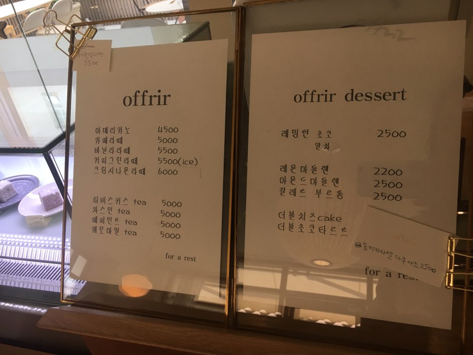 카페 오프리르 메뉴는 음료/디저트로 나뉘어져있더라고요. 위에는 커피 밑에는 티 메뉴들로나뉘어져있고 오른쪽에는 디저트가 준비되어있습니다.