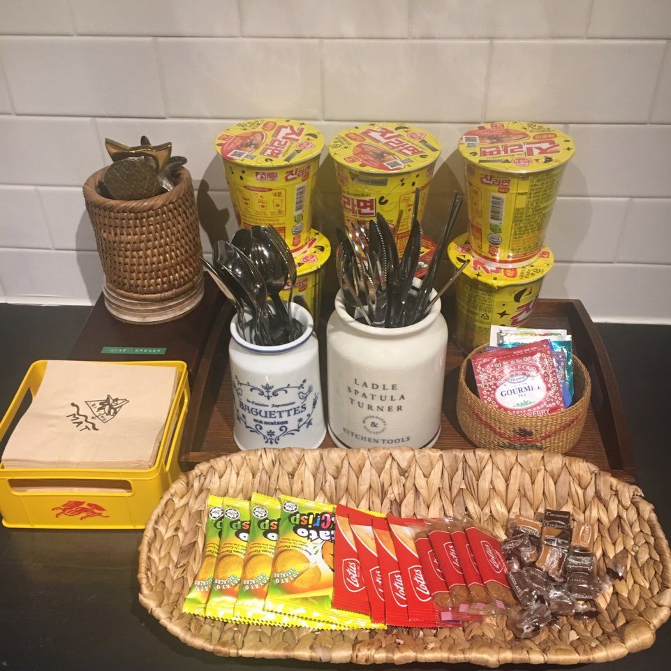 다이빙 맛 오픈 키친입니다. 이곳에서 포장해온 음식이나 컵라면을 먹을 수 있다고 해요. 숙소에 묵는 분들을 위해 컵라면과 과자, 초콜릿, 비스켓을 놓아둔 섬세함... 또 한 번 손님들을 생각하는 섬세함이 느껴졌습니다.