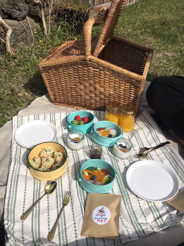 다이빙 맛을 숙소로 선택하게 된 두 번째 이유 바로 조식이 나오는데 조식마저 감성적인 것..ㅋㅋㅋㅋㅋ 아침 조식으로 바구니 속에 과일과 샐러드, 요구르트와 오렌지주스 그리고 직접 만드신 유부초밥이 들어있었습니다. 평소 샐러드를 좋아하지 않는 조상님도 맛있게 잘 드시더라고요.