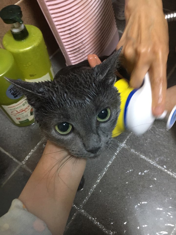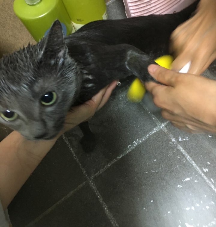 재빠르게 샴푸를 구석구석 바른 후 페스룸샤워기로 빗으면서 샴푸거품을 제거해보았는데....!! 도망치느라 바빴던 냥님이 가만히 계시더라고요! (광고아님) 하지만 아직까지는 적응단계이기때문에 ... 완전히 놓으면 도망가시고 잡은채로 빗어주어야 순하게 계셨습니다.