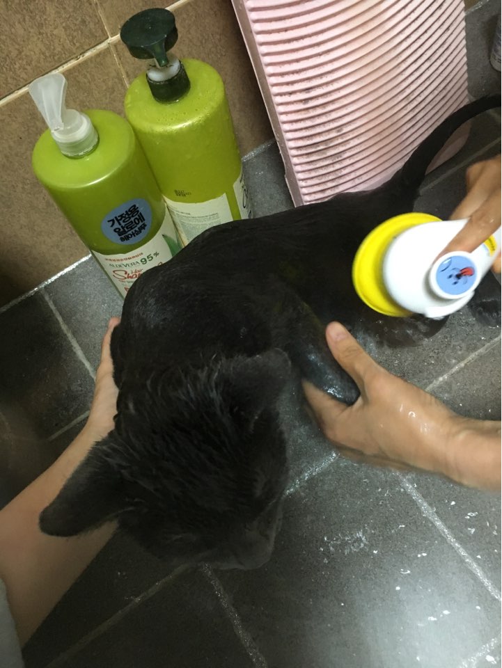 재빠르게 샴푸를 구석구석 바른 후 페스룸샤워기로 빗으면서 샴푸거품을 제거해보았는데....!! 도망치느라 바빴던 냥님이 가만히 계시더라고요! (광고아님) 하지만 아직까지는 적응단계이기때문에 ... 완전히 놓으면 도망가시고 잡은채로 빗어주어야 순하게 계셨습니다.