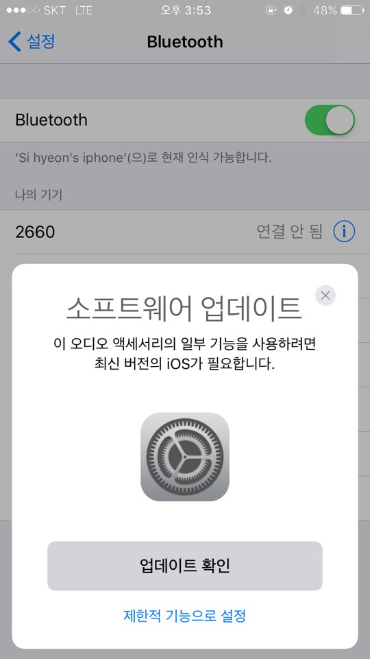 처음 아이폰과 연결하려고 하니 최신버전의 IOS가 필요하다며.. 업데이트를 추천하더라고요. 하지만 절대 업데이트를 할생각이 없다!! 하시는분들은 아래의 '제한적 기능으로 설정' 을 클릭해주시고 에어팟을 사용하시면 됩니다.