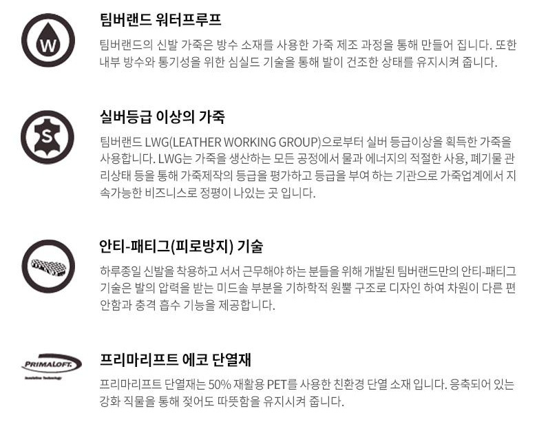 워터프루프, 실버 등급 이상의 가죽을 사용하고 하루 종일 신발을 착용하여도 발의 압력을 받는 미드솔 부분을 기하학적 원뿔 구조로 디자인하여 편안함과 충격흡수 기능을 제공한다고 합니다. 이외에도 프리마 리프트 단열재를 사용하여 젖어도 따뜻함을 유지시켜준다고 해요.