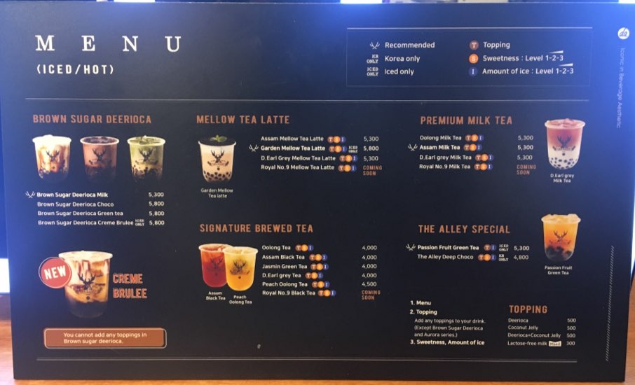 메뉴 옆의 T/S/I 아이콘은 T=Topping, S=Sweetness :Level 1-2-3, I=Amount of ice Level 1-2-3라고 해요. 그리고 추가로 우유를 드시지 못하는 분들을 위해 금액 추가시 배탈이 나지 않는 우유로 바꿔 주는 것도 있더라고요.