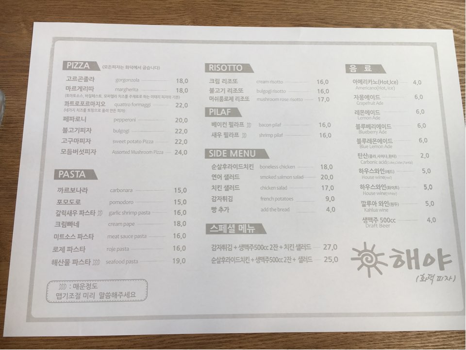 해야 레스토랑의 메뉴입니다. 여기는 화덕피자가 맛있고, 유명하다고해요. 고르곤졸라 피자와 까르보나라, 머쉬룸로제 리조또를 주문하였습니다.