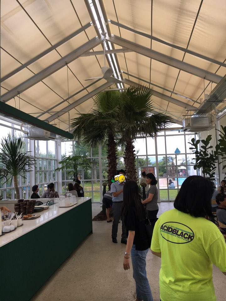 온실 안에는 통유리와 정말 온실 안에 있는듯한 느낌을 주는 나무들.. 날씨가 덥지만 않으면 천장도 오픈되어있겠지만 햇볕이 따가운 여름이라 닫아놓았더라고요. 다음엔 날씨가 덥지 않은 날 천장이 모두 오픈되어있을 때 다시 한번 방문해보고 싶었습니다.
