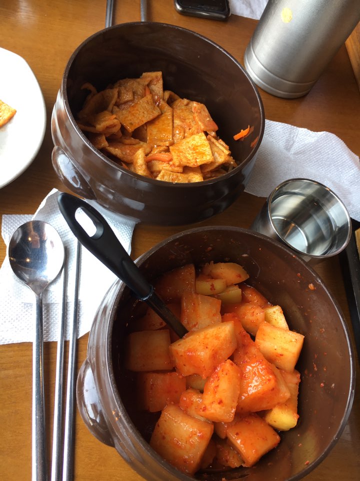 메뉴를 주문하면 밑반찬을 가져다주시는데 양껏 덜어 먹을 수 있도록 깍두기와 어묵무침을 큰 단지채로 가져다주셨습니다. 반찬을 아낌없이 주셔서 너무 잘 먹었어요.