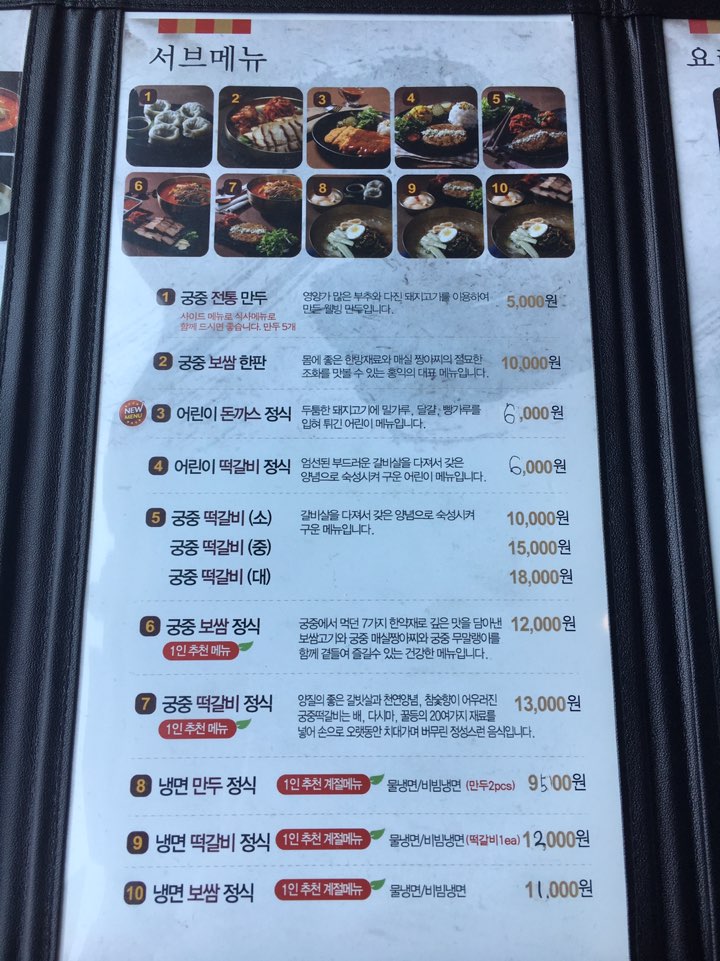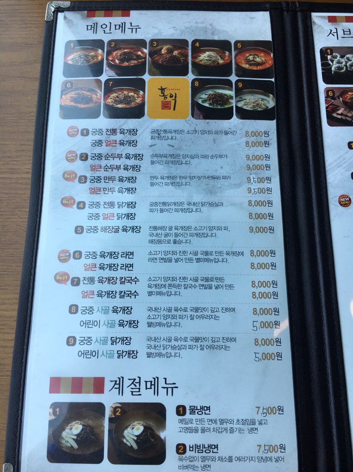 홍익 궁중 전통 육개장 메뉴판입니다. 육개장 전문점답게 육개장이 메인이고, 그다음 육개장 칼국수, 닭개장, 계절메뉴로 물냉면과 비빔냉면, 그리고 서브메뉴로 만두, 보쌈, 돈가스, 떡갈비가 준비되어있었습니다. 이외에도 안주로 전골과 닭강정, 오리바비큐도 준비되어있으니 참고해주세요.