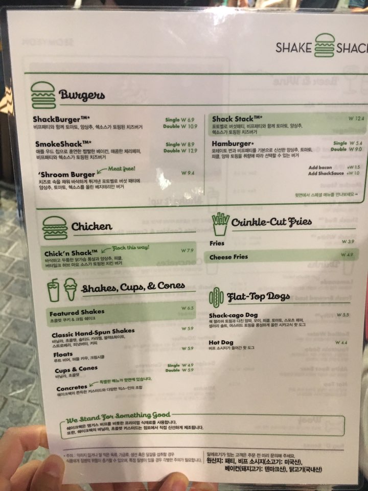 쉑쉑버거 메뉴입니다. 쉑 버거가 기본 버거고요. 스모크쉑은 베이컨+체리페퍼+비프패티+쉑소스가 포함된 치즈버거, 슈룸버거는 버섯패티가 들어간버거, 쉑스텍 버거는 슈룸버거+쉑버거와 합쳐진것이라고 보시면 됩니다.