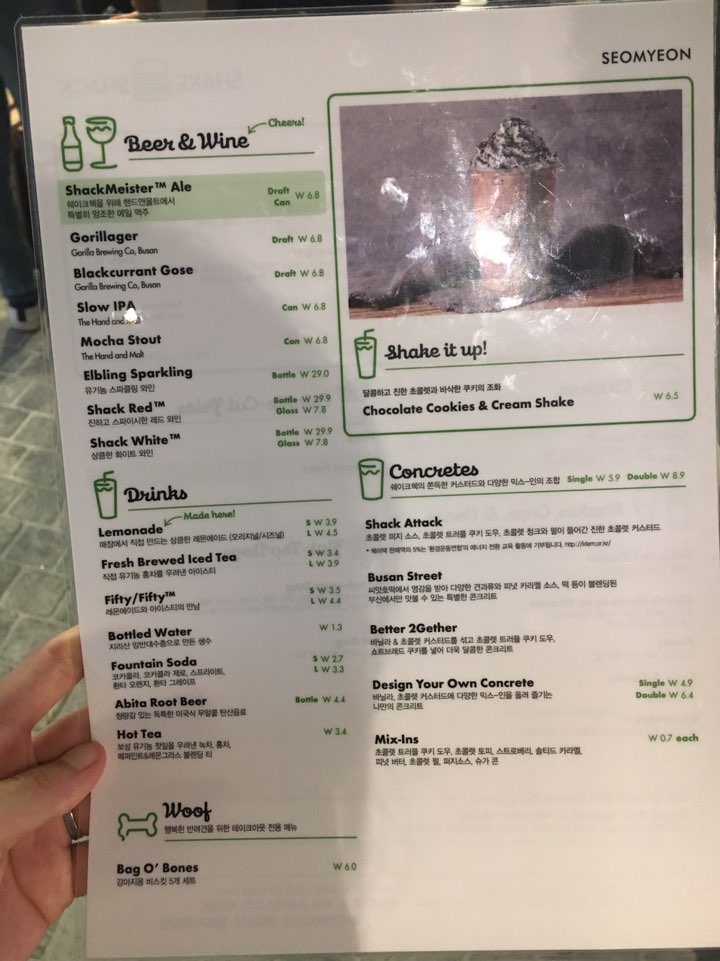그리고 부산에서만 판다는 시멘트?콘크리트? 그 음료는 그냥 견과류를 좋아하는분아니면 추천하지 않는다고 해요. 쉑쉑버거의 가격대는 높은편이니 신중하게 생각하시고 주문하셔야합니다.