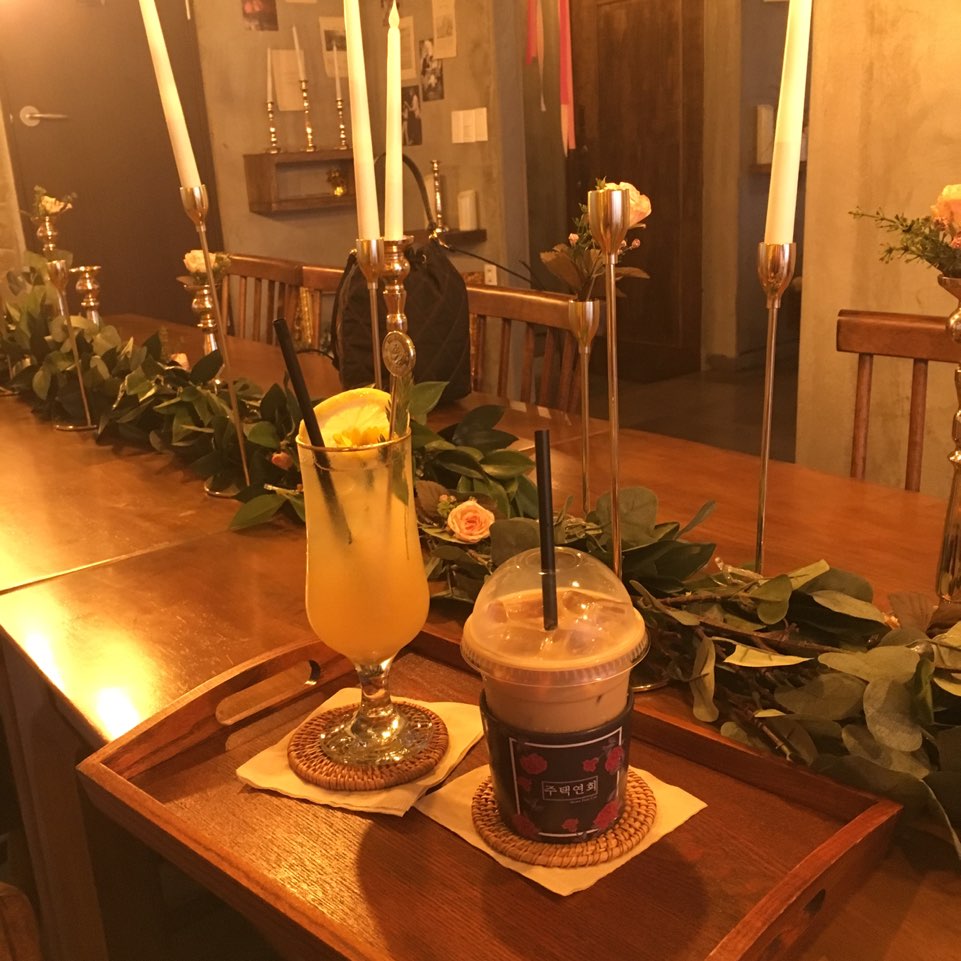 주택 연회 카페 1층 내부입니다. 은은한 조명에 친구 집에 놀러 온 듯한 소파와 테이블.. 조명이 노랑노랑 해서 사진을 찍으면 정말 잘 나옵니다.