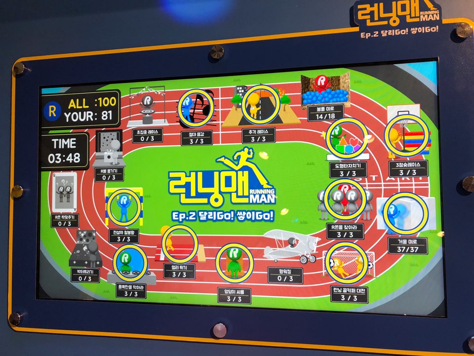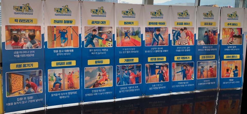 런닝맨 내부의 게임들이 런닝맨앞에 전시되어있었습니다. 런닝맨 게임종류는 박 터트리기 / 전설의 철봉왕 / 골키퍼 대전 / 제자리 멀리뛰기 / 물폭탄을 막아라 / 초집중 레이스 / 절대 음감 / 추격 레이스 / R볼 옮기기 / 엉덩이 씨름 / 웡워킹 / 거울미로 / R몬을 찾아라 / R몬 짝맞추기 / 도형 타자치기 / 3점슛 레이스가 있습니다.