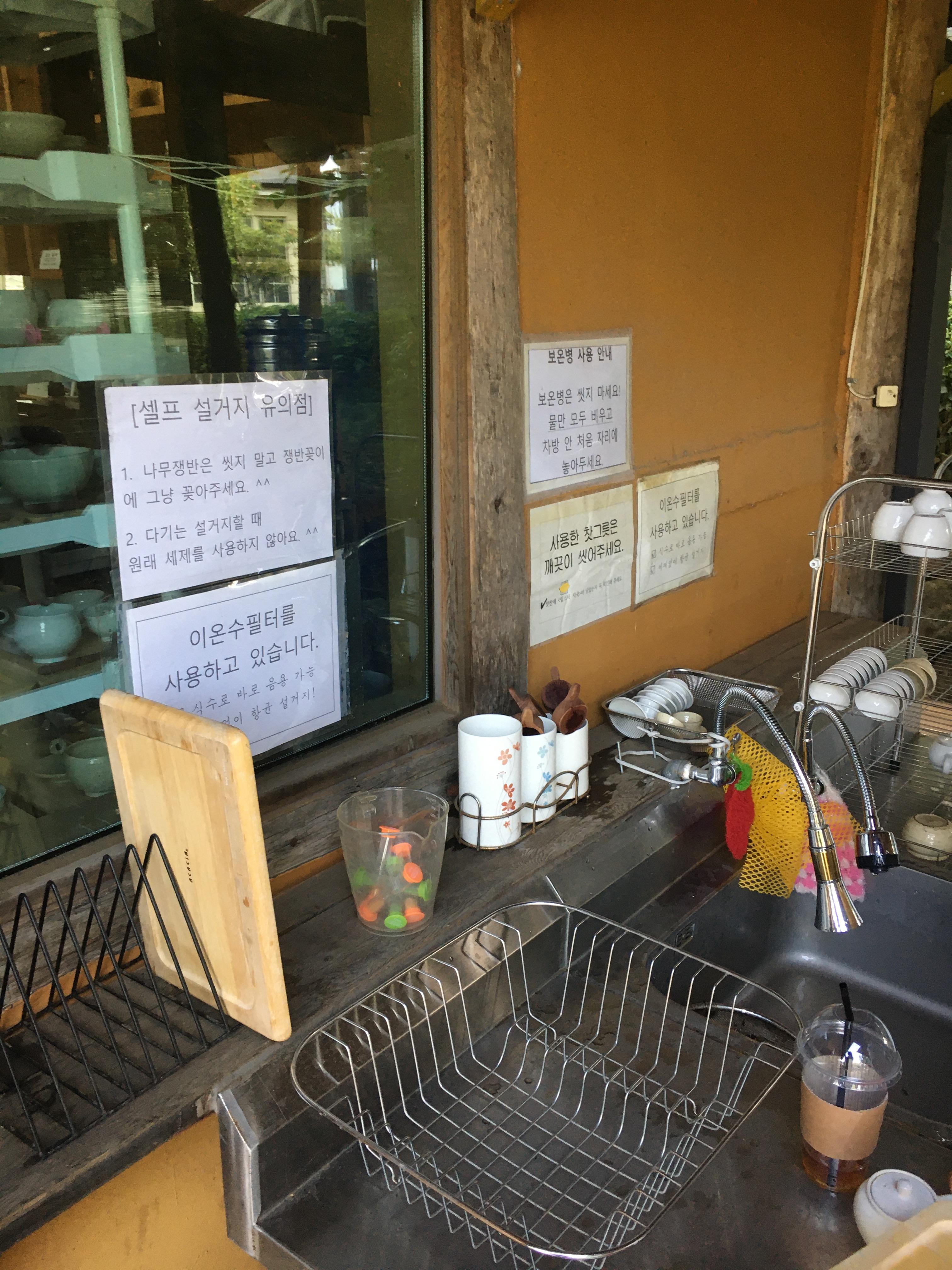 다기세트를 이용하셨다면 셀프로 설거지를 해주셔야 합니다. 나무쟁반과 보온병은 씻지 않고 쟁만 꽂이/보온병 자리에 두시면 되고, 다기는 설거지할 때 세제를 사용하지 않는다고 해요.