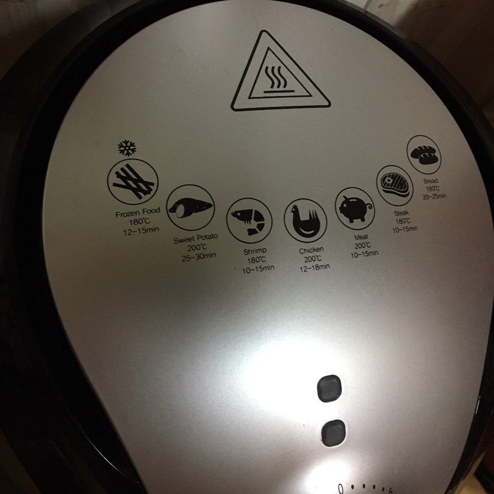 에어 프라이기 상단에는 간단한 요리들의 조리방법이 나와있습니다. 냉동음식 180도에서 12분 - 15분, 고구마 200도에서 25 - 30분, 새우, 닭, 돼지 등 조리방법이 나와있더라고요.