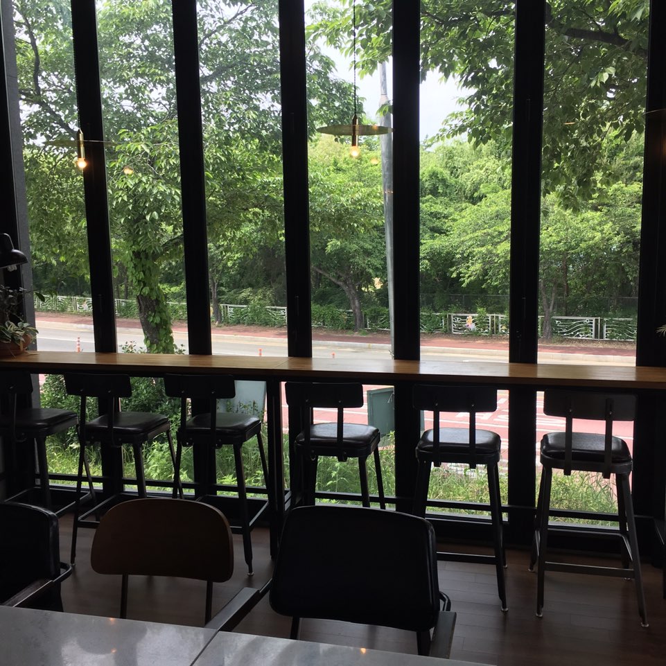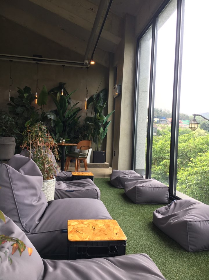 SNS에서 주로 보이는 #야드 하면 보이는 이곳 바로 빈백 존인데요. 통유리로 창밖 너머를 보며 반 누워서 커피를 마실 수 있다는 점이 정말 좋았습니다. 하지만 창밖 너머는 큰 나무들의 잎사귀밖에 보이지 않는다는 단점이...... 벚나무라 벚꽃이 피었을 때는 정말 이쁠 것 같더라고요.