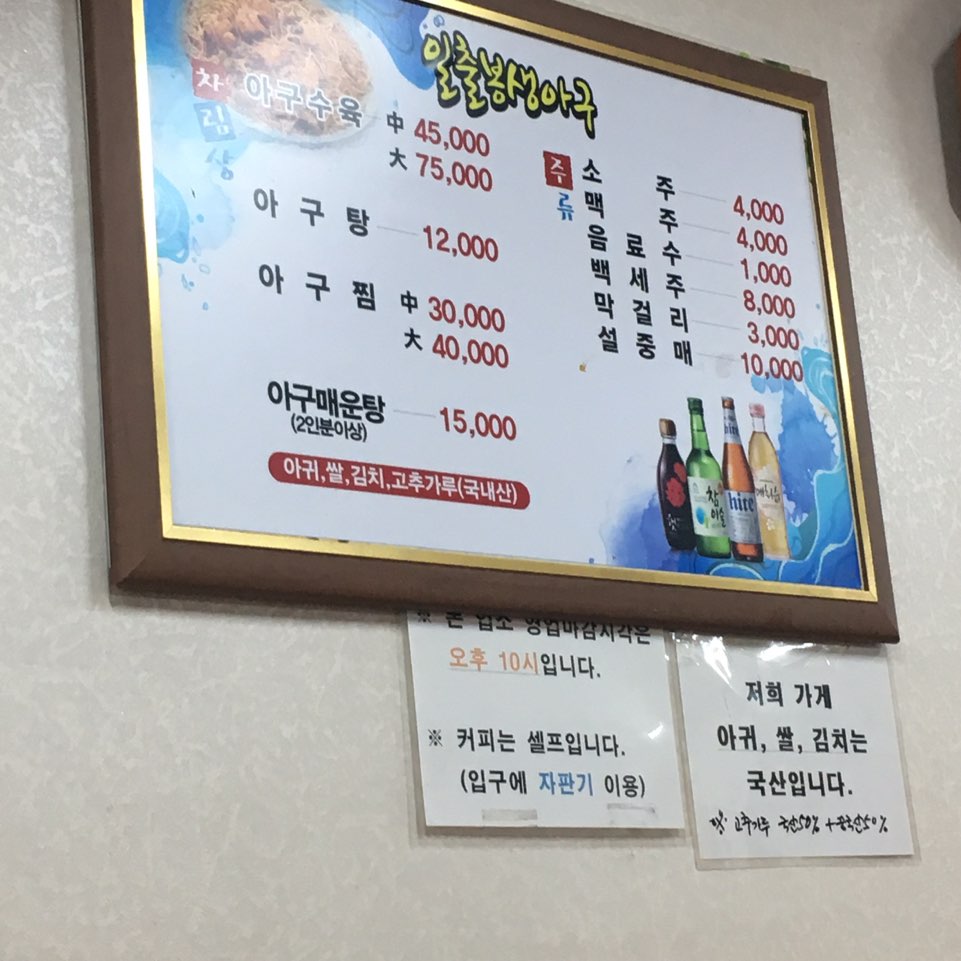 아구 전문점이기 때문에 아구 수육, 아귀탕, 아귀찜, 아구 매운탕(2인분 이상) 메뉴들이 준비되어있습니다. 아귀, 쌀, 김치 모두 국내산을 사용한다고 해요. 고춧가루는 국산 50% + 중국산 50% 라는 깨알 같은 글이 보이네요...