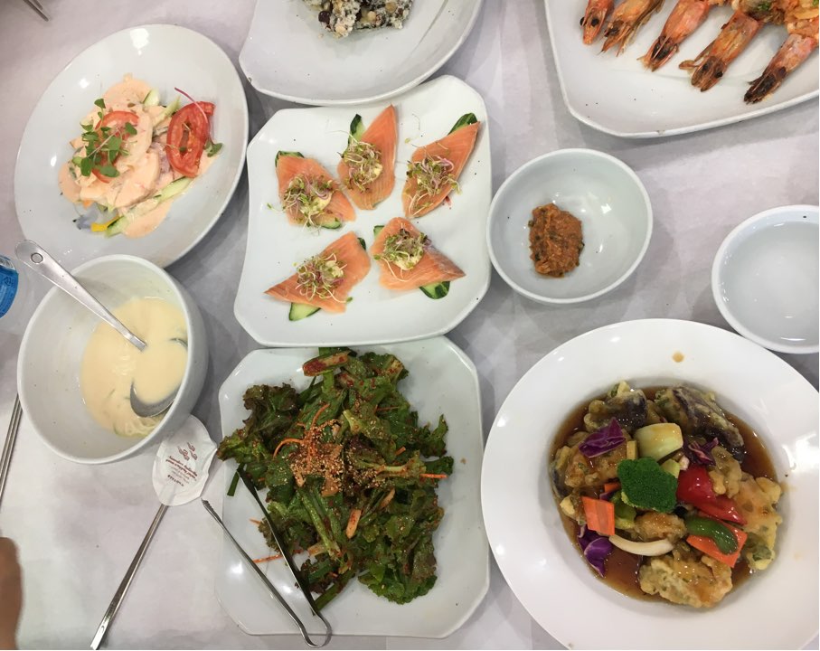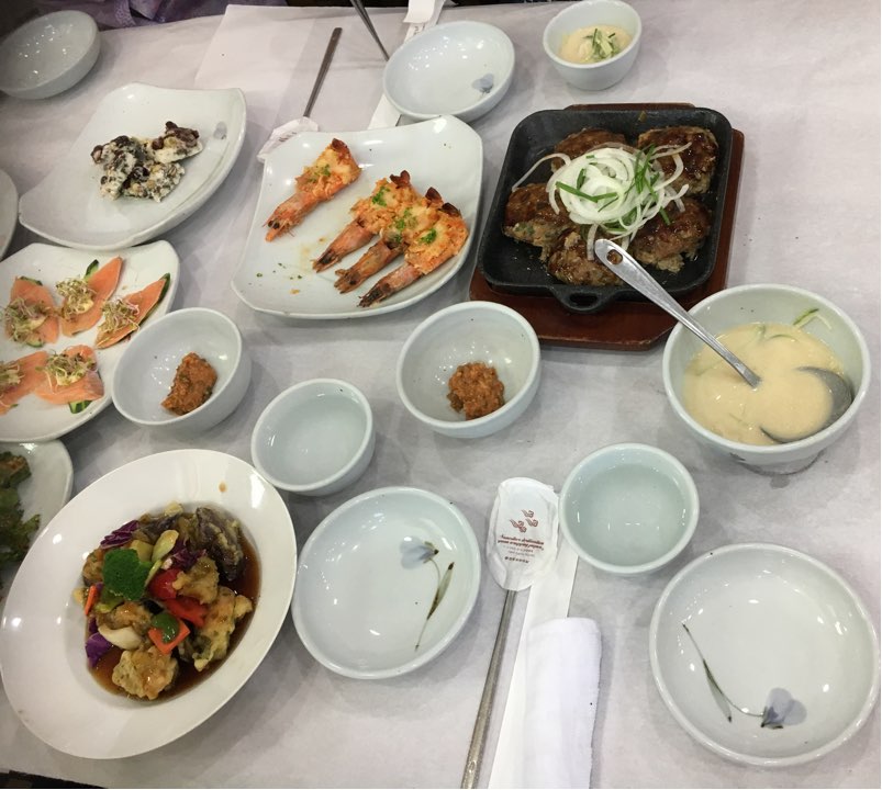 처음에 나온 상차림 보고 깜짝 놀랐던 것.. 인당 17,000원이라 그렇게 큰 기대를 하지 않았는데 울산 한정식보다 양도 많고 푸짐하더라고요.. 샐러드와 떡, 연어, 부침개, 가지&단호박 튀김, 떡갈비, 콩국수까지 정말 푸짐하였습니다.