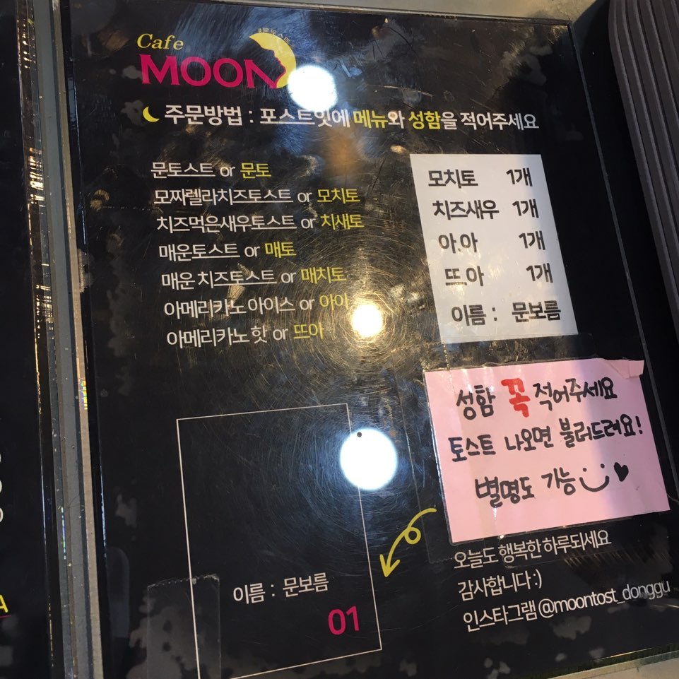 문 토스트 주문방법은 메뉴판앞에 준비되어있는 포스트잇에 메뉴와 이름또는 별명을 적어주시면 된다고 해요. 사람이 없을때는 메뉴이름을 불러주시지만 사람이 많을땐 이름으로 불러주신다고해요.