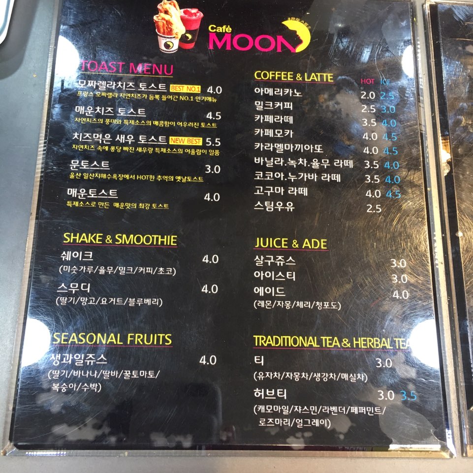 문 토스트 메뉴입니다. 문토스트하면 생각나는 모짜렐라 치즈토스트와 치즈먹은 새우토스트, 문토스트, 매운토스트를 판매하고요. 음료와 커피들도 판매하고있으니 참고해주시기 바랍니다.