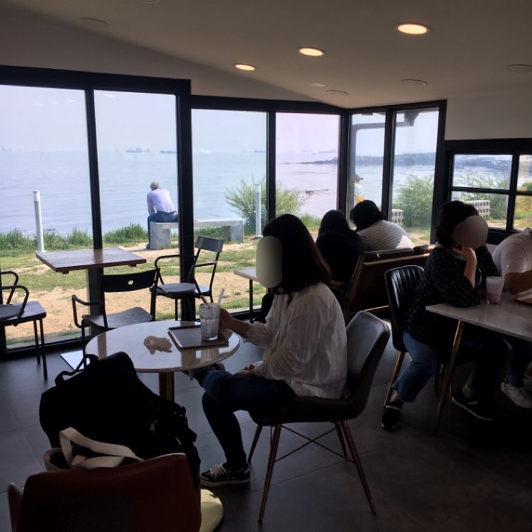 카페 내부에서 바라보는 밖의 풍경은 정말 아름다웠지만.. 막상 야외석에 앉게 되면 미세먼지 때문에 푸른 바다와 맑은 하늘을 볼 수가 없어 답답하기만 합니다. 날씨가 맑고 미세먼지가 덜한 날 방문하면 정말 예쁠 것 같더라고요.