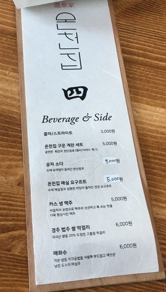 온천 집 메뉴입니다. 메뉴판종이가 한지로 되어있고 메뉴판과 가게분위기랑 잘어울리더라고요. 메뉴는 트리플 튀김덮밥, 로스트 비프 스테이크 덮밥, 온천집 1인 샤브샤브가 준비되어있습니다.