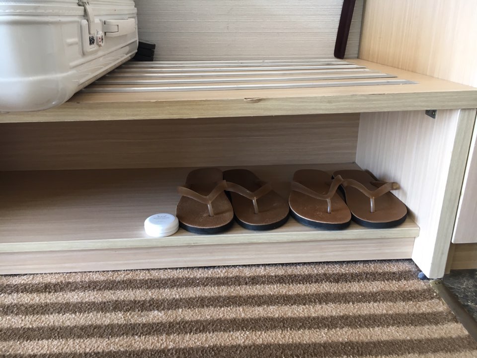 그리고 캐리어 다이 아래 보시면 방 안에서 신고 다닐 수 있는 쪼리가 준비되어있습니다. 이 쪼리를 모르고 불편하게 가지고 오신 운동화를 신고 다니시는 분들이 계시더라고요. 편하게 신고 다니시면 됩니다. 저는 조식 먹을 때, 수영장 갈 때도 이 쪼리를 신고 다녔어요. ㅎㅎ 아무도 뭐라고 하지 않습니다.
