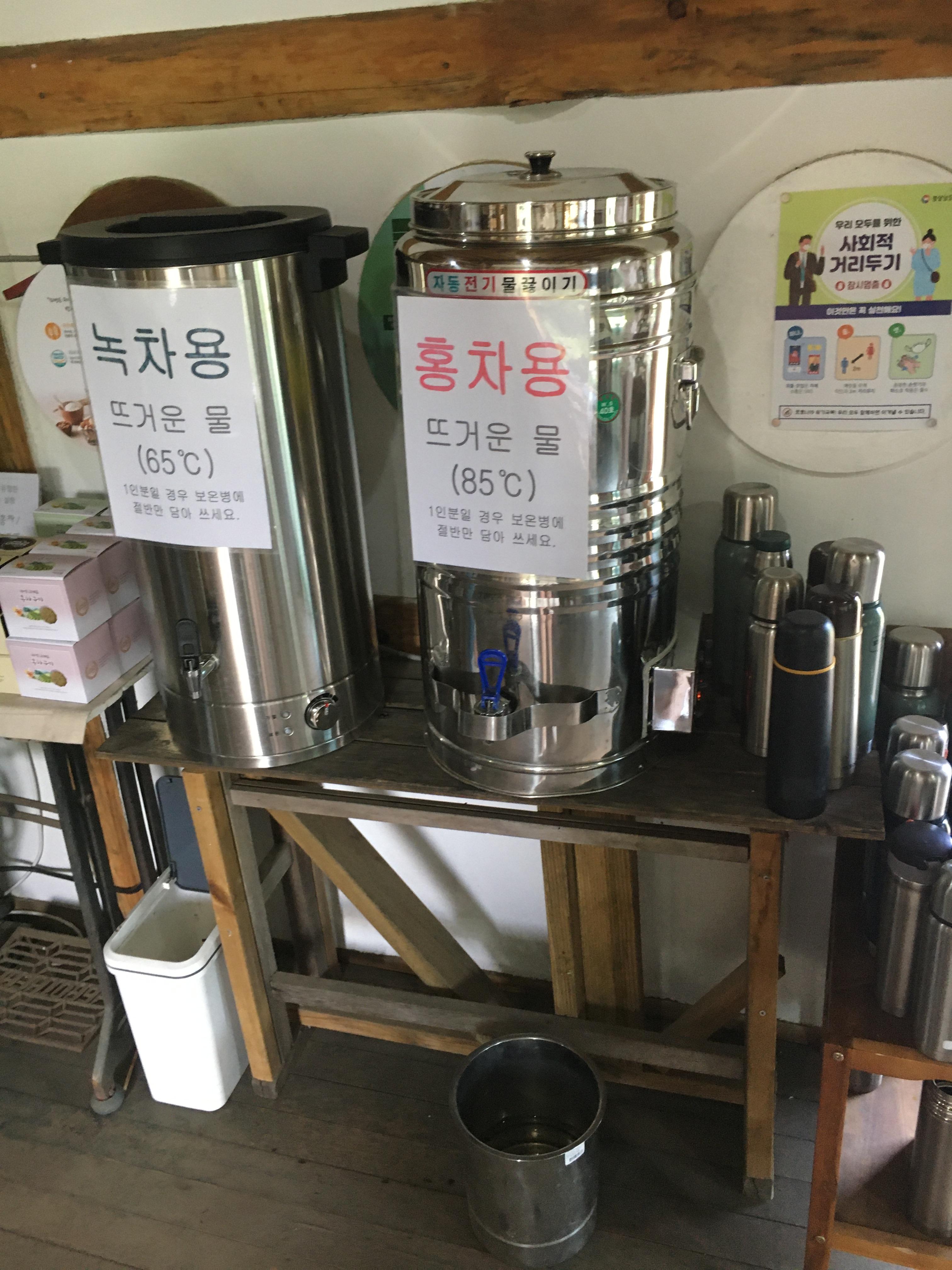 따뜻한 차를 선택하셨다면 주문한 곳 오른쪽에서 녹차용/홍차용 물을 따로 보온병에 담아 가셔야 합니다. 각 차를 즐기기 좋은 온도로 맞춰져 있으니 홍차를 주문해주셨으면 홍차 물을, 녹차를 주문해주셨으면 녹차물을 보온병에 담아 가시면 됩니다.