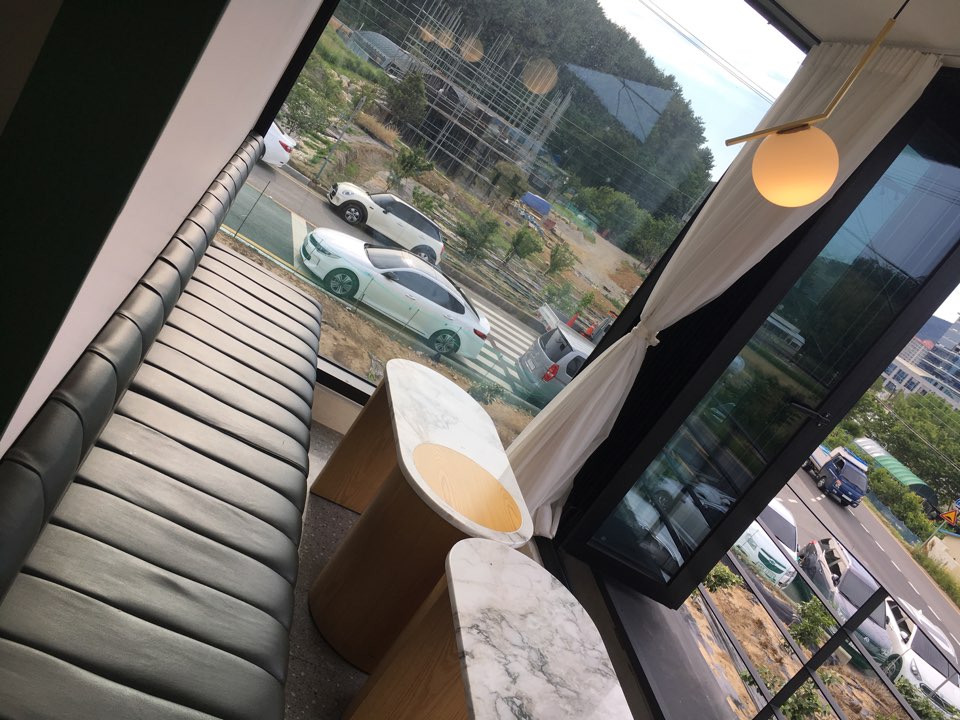 2층으로 올라오면 밖을 바라보며 커피를 즐길 수 있는 소파와, 거울 셀카를 찍을 수 있는 거울 셀카 존(?)이 있습니다. 밖을 바라보며 커피를 마실 수 있는 이 소파 자리가 가장 인기 있더라고요.