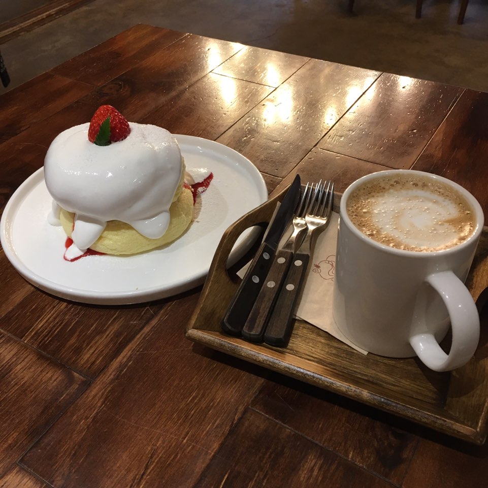 그렇게 오래 기다리지 않은 것 같은데 수플레 팬케이크가 금방 나왔습니다. 주문한 바닐라라테 먼저 마셔봤는데 흠... 수플레로 유명한 곳이니 수플레는 맛있겠지? 하며 수플레를 먹어보았는데요.