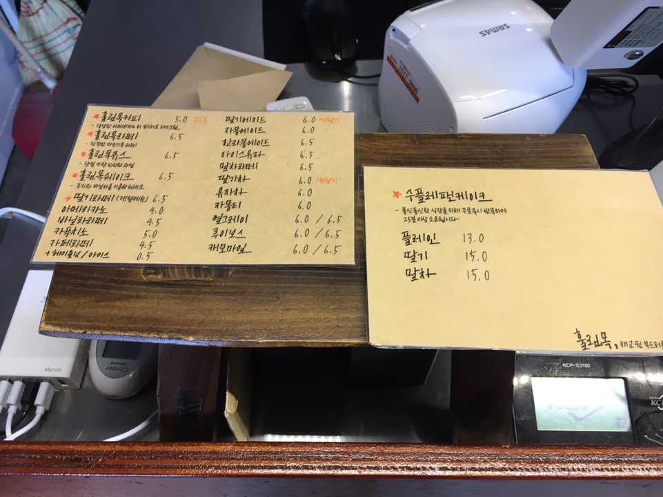 훌림목 메뉴입니다. 메뉴 앞에 별 모양이 있는 것이 인기 있는 메뉴라고 해요. 그리고 훌림목 대표 메뉴인 수플레 팬케이크도 준비되어있습니다. 팬케이크 위에 플레인/딸기/말차 중에 선택하시면 됩니다.