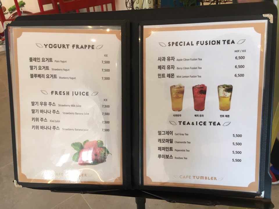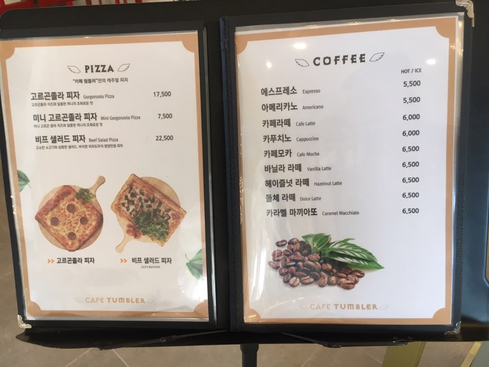 카페 텀블러 메뉴입니다. 커피, 요구르트, 생과일, 티, 스페셜 커피, 라떼, 에이드 메뉴들과 피자를 함께 판매하더라고요? 고르곤졸라 피자가 너무 먹고 싶었지만.. 점심을 먹고 방문했더니 배가 너무 불러서 먹지는 못했습니다..