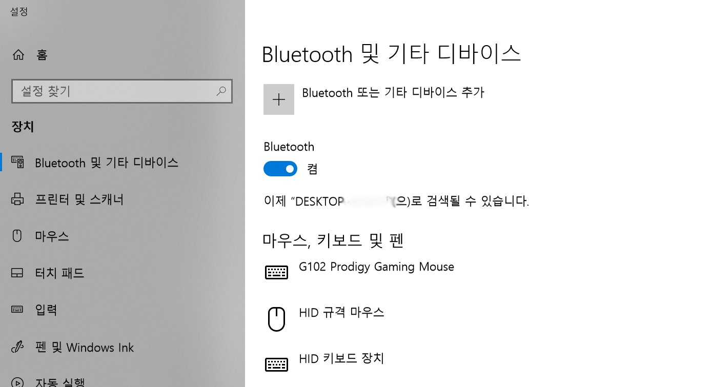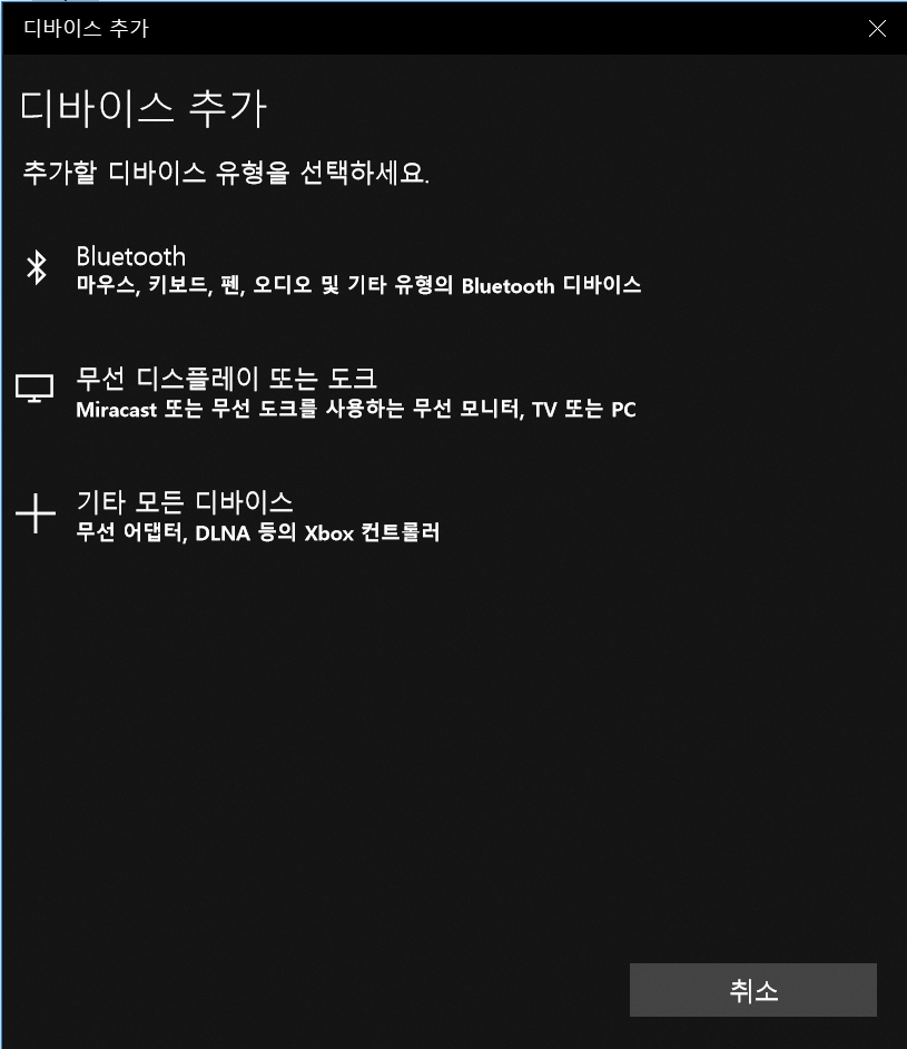 블루투스 또는 기타 관리자추가를 클릭하게되면 위와같이 창이 뜨게됩니다. 제일 위의 Bluetooth/ 마우스, 키보드, 펜, 오디오 및 기타 유형의 Bluetooth 디바이스를 클릭하세요.