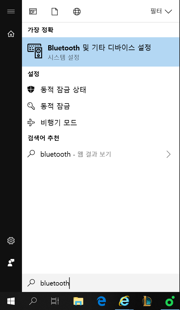 먼저, 윈도우 시작버튼을 누른 후 바로 'bluetooth'를 입력하시고 엔터를 눌러주시면 블루투스 관리자창이 뜨게됩니다.