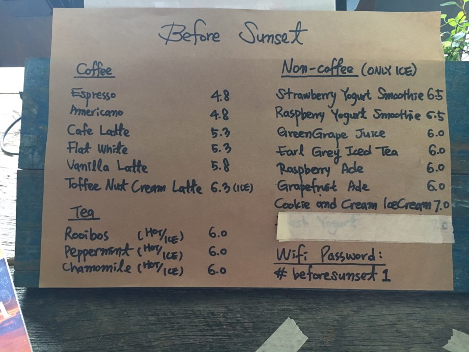 비포 선라이즈 메뉴입니다. 커피와 티, 논커피메뉴들이 준비되어있는데 논커피 메뉴들은 아이스밖에 되지않으니 참고해주시기 바랍니다.